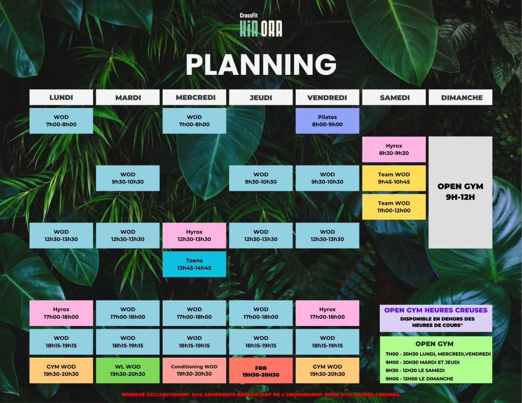 Chez CrossFit Kia Ora, on sait à quel point il est important de pouvoir concilier sport et vie quotidienne. C’est pourquoi nous avons pensé notre planning pour qu’il soit accessible à tous, quels que soient vos horaires.